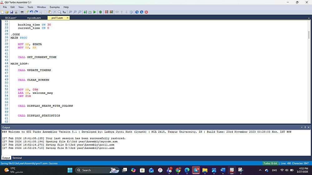 قمت بتطوير نظام متكامل لحجز المقاعد وإدارة التذاكر باستخدام لغة التجميع (Assembly)، يعمل في بيئة Real-mode. المشروع يبرز القدرة على التعامل المباشر مع موارد الحاسوب وتطوير خوارزميات إدارة الوقت والموارد بدون الاعتماد على لغات برمجة عالية المستوى.