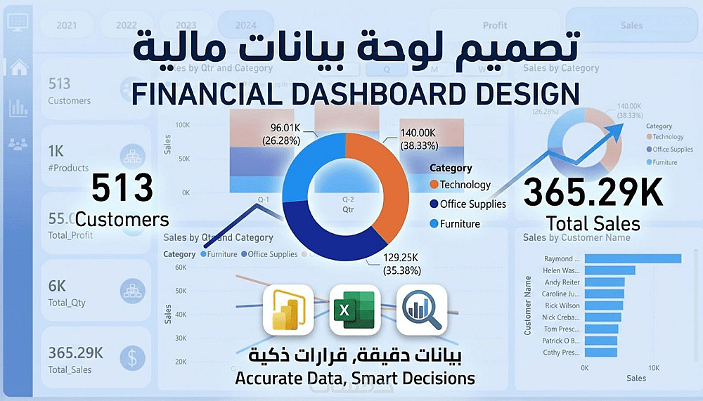 تصميم لوحات بيانات (Dashboards) احترافية وتفاعلية باستخدام Power BI أو Excel