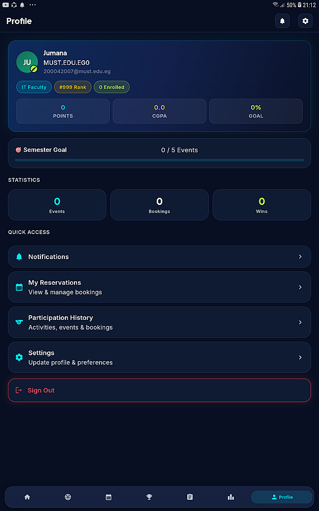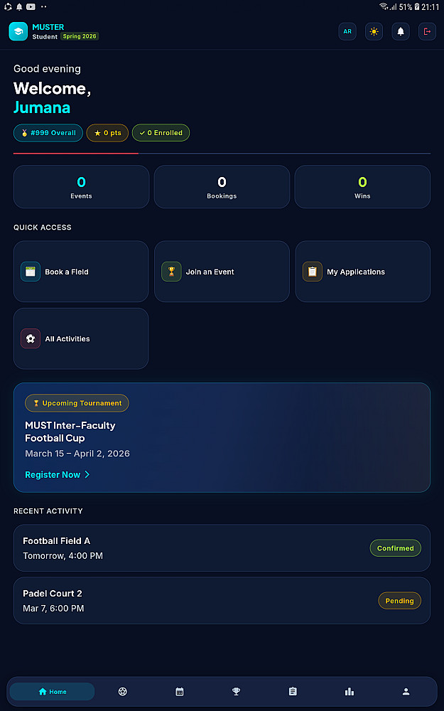 سأقوم بتطوير تطبيق جوال متكامل باستخدام Flutter لإدارة الأنشطة الرياضية الجامعية — تطبيق احترافي يدعم اللغتين العربية والإنجليزية مع واجهة RTL كاملة، مخصص للطلاب والمدربين والإداريين.