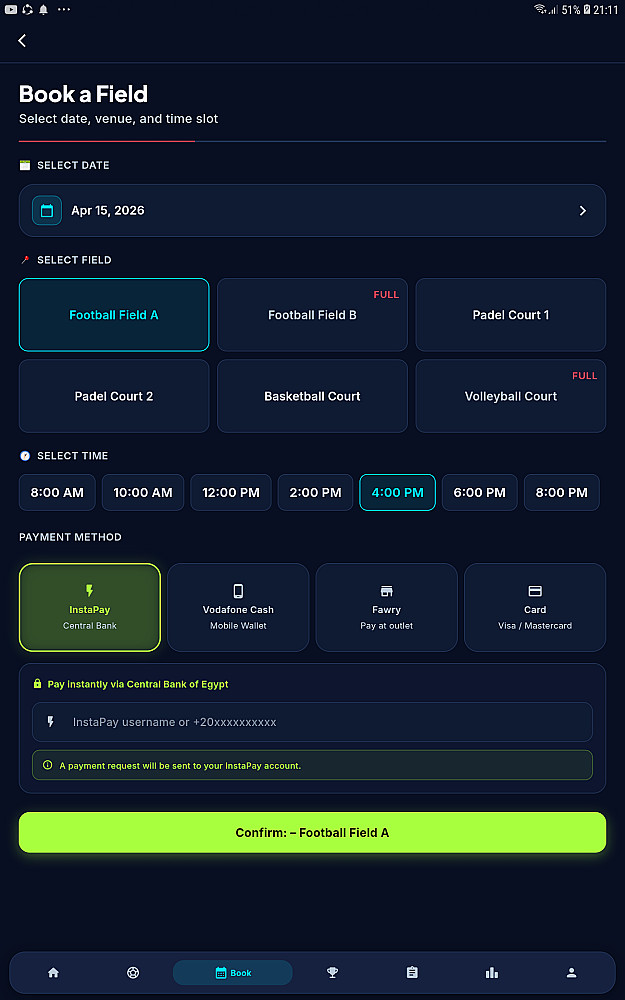 • نظام حجز الملاعب — حجز الملاعب والمرافق بالتاريخ والوقت