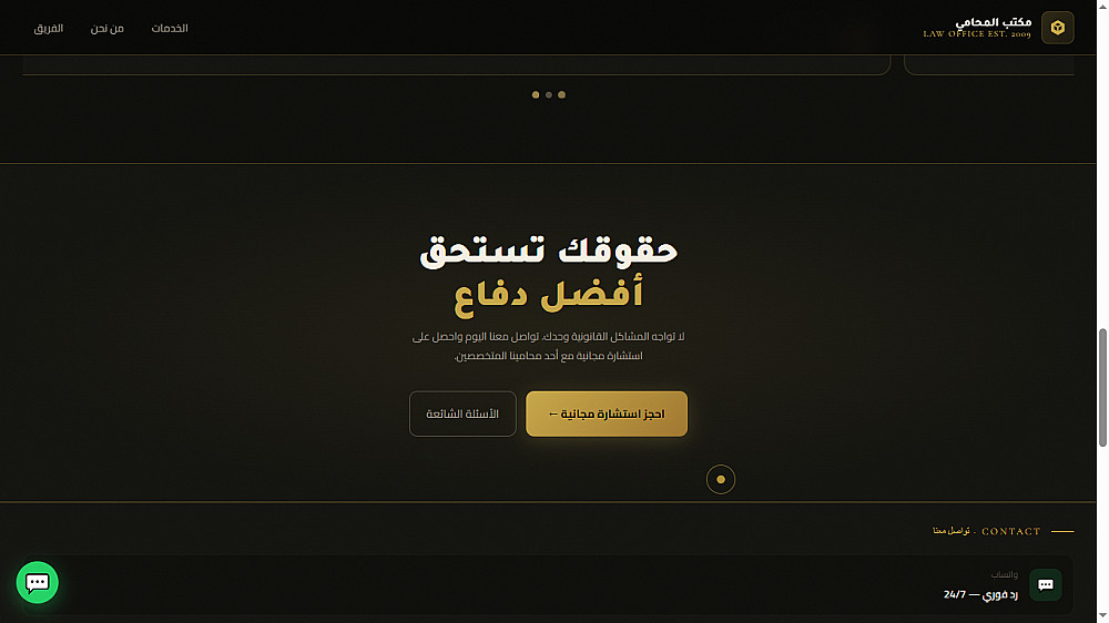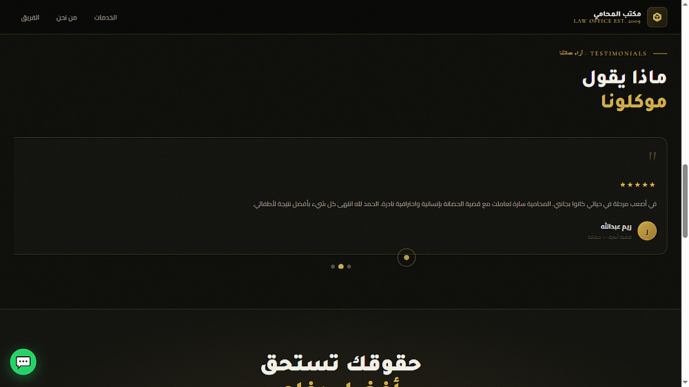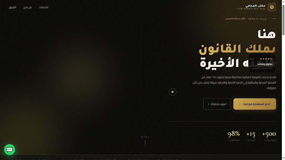 صفحة رئيسية جذابة تعرض اسم المحامي، التخصص، وصورة احترافية