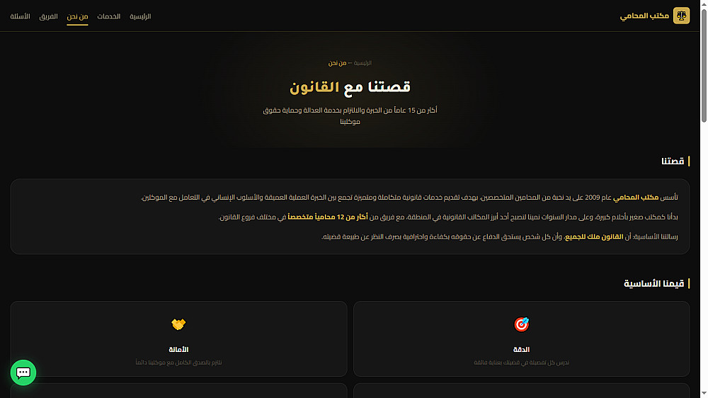 صفحة "من نحن" تحتوي على السيرة الذاتية والخبرة القانونية