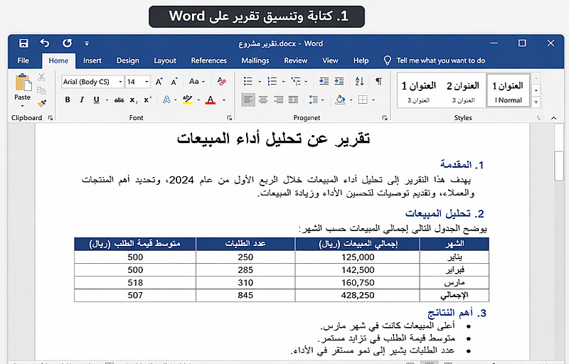 تنسيق احترافي يشمل العناوين، الفقرات، والجداول داخل الملف.