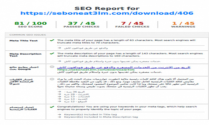 سوف اقوم بتحليل موقعك واختبار سرعة الوقع و السيو واستجابة الموقع على الهاتف المحمول وسوف اقوم اختبار قوق السيرفر ونظم الحماية وسوف نقدم لك افضل واسهل طرق الحل البرمجية مما سياعدك على تصدر نتائج البحث وعدم الحصول على اى معاقبات من طرف جوجل .