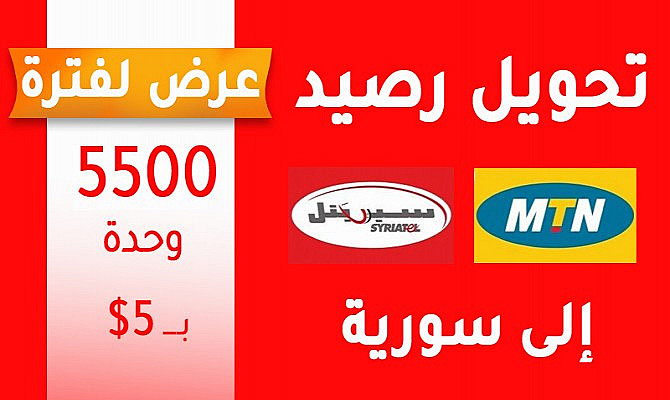عرض لفترة محدودة 5500 وحدة رصيد او فاتورة لشبكة سيرتيل او mtn في سورية مقابل 5 دولار.