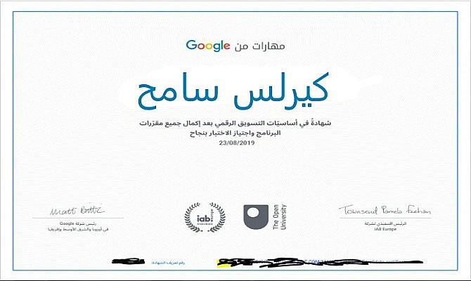 الشهادة معترف بها فهي تحمل توقيع رئيس شركة جوجل في اروبا والشرق الاوسط وشمال افريقيا توقيع الرئيس التنفيذي لشركة IAB europe