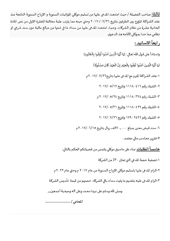 من واقع خبرة ودراية قانونية رفيعة المستوى في المحاماة و الأعمال القضائية والبحث المتعمق في الأنظمة واللوائح السعودية سوف أقوم بصياغة لائحة دعوى قضائية تمتاز بجودة الصياغة القانونية ، تعبر بدقة عن الحق المطالب به على أساس متين من أحكام الشريعة الإسلامية الغرَّاء ، وأنطمة ولوائح المملكة العربية السعودية ،وأحكام القضاء السعودي بكافة فروعه.