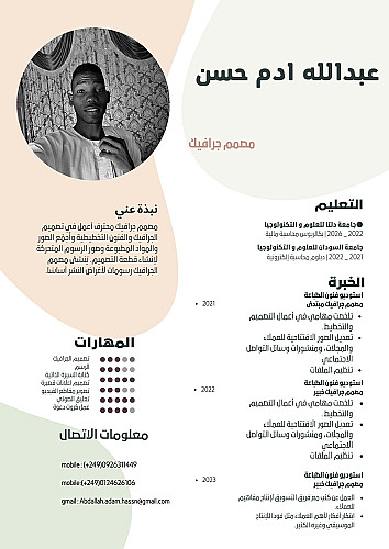 السلام عليكم اخوكم عبدالله من السودان جامعة دلتا مصمم سير ذاتية . اعلانات . فيدهات قصيرة . تصمم كروت شخصية .
