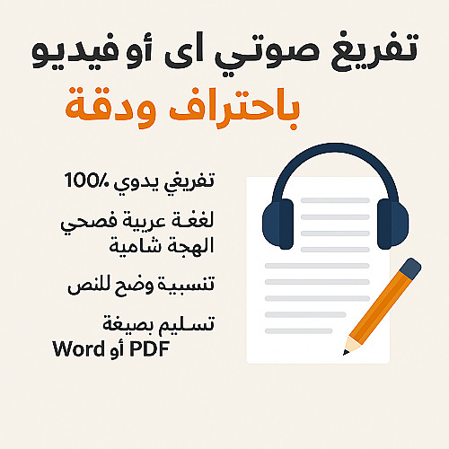 انا حلوش أقوم بتفريغ الملفات الصوتية أو الفيديوهات إلى نص مكتوب باللغة العربية بدقة واحترافية. تفريغ يدوي، تنسيق مرتب، وتسليم بصيغة Word أو PDF. السع ....